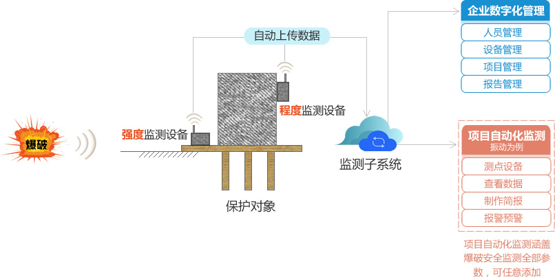 是针对爆破安全检验检测机构研制的数字化管理工具和自动化监测平台,该系统不仅能对爆破有害效应强度、保护对象受爆破有害效应影响程度进行自动化监测;还能对监测机构的人员、项目、设备和报告进行数字化管理。