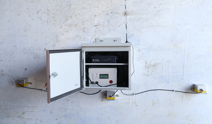 膨胀螺栓、夹具固定三支传感器,膨胀螺栓固定防护箱,连接电缆延长线并引入防护箱内,4G天线引入防护箱,连接仪器(仪器需市电或锂电池为其供电)